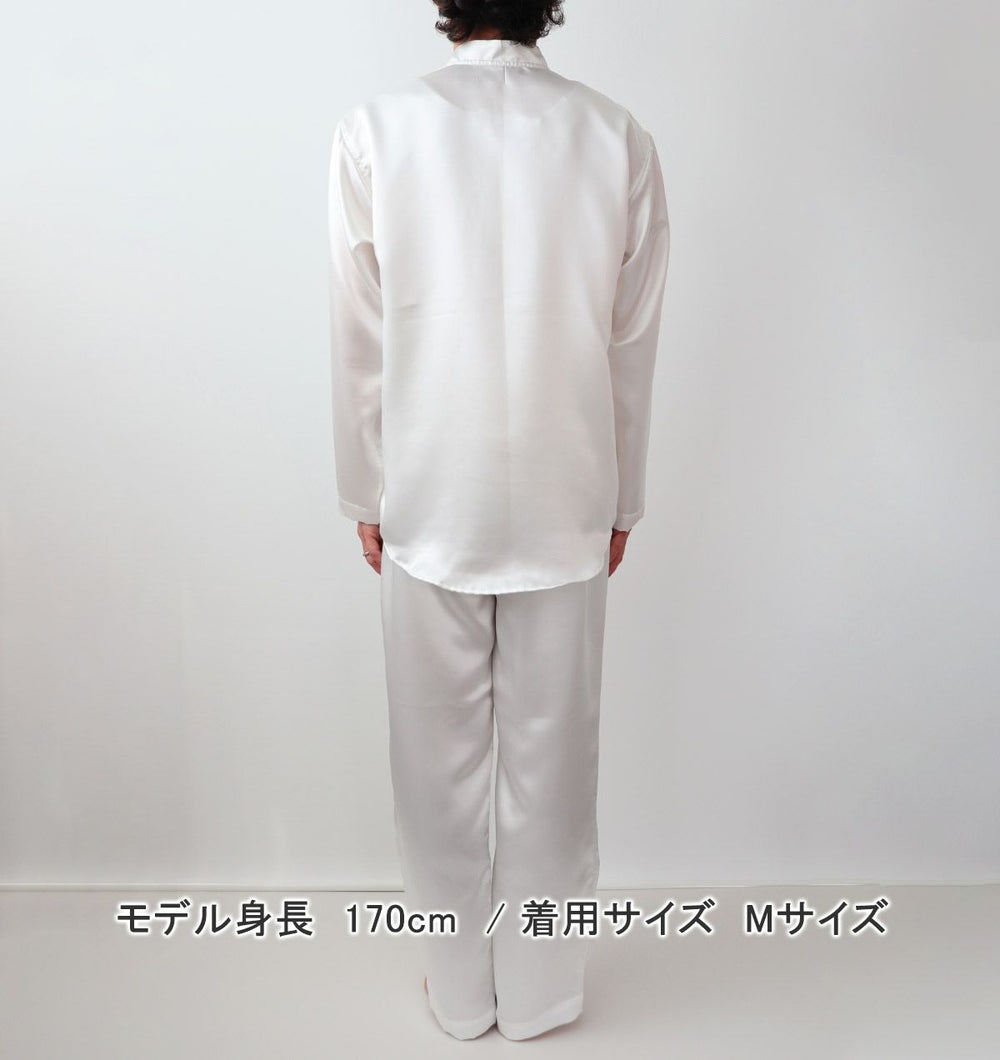 シルクは多孔質のため「夏涼しく、冬温かい」という温度調節の役割をもっています。綿に比べて吸水性、吸湿性が1.5倍でより蒸れを感じにくく、ほどよい保温性がありつつも、温度調整をしてくれるため、夏涼しく、冬温かい、一年中快適なバンドカラーパジャマとなっています。