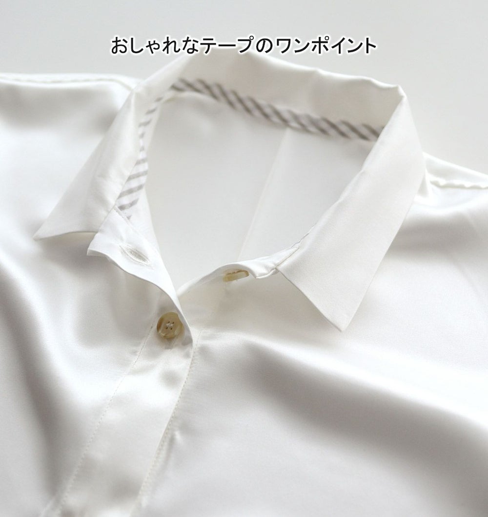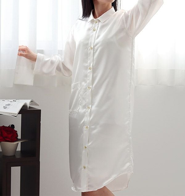 国産の川俣シルクサテンの美しいドレープ性。前開きのシャツワンピースは、羽織りやガウンとしてもお使いいただけます。パジャマ感の少ないデザインなので、パジャマやネグリジェ、ルームウェアとしてだけでなく、ちょっとした外出にも。