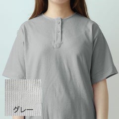 1枚で大人っぽくおしゃれな印象になれるヘンリーネックデザイン。窮屈すぎないデザインで1度着たら病みつきになる、1日中着ていたくなる着心地です。かぶりなので、突然の来客でも着脱しやすく部屋着、ルームウェアとしても最適の1枚です。ボタンをはずしただけで全く違う印象に。