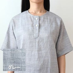 1枚で大人っぽくおしゃれな印象になれるヘンリーネックデザイン。窮屈すぎないデザインで1度着たら病みつきになる、1日中着ていたくなる着心地です。かぶりなので、突然の来客でも着脱しやすく部屋着、ルームウェアとしても最適の1枚です。ボタンをはずしただけで全く違う印象に。
