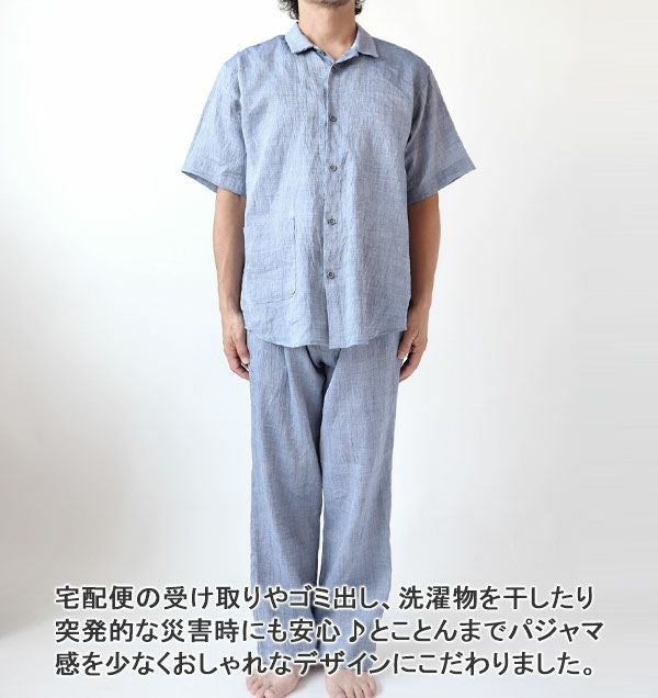 近江ちぢみ麻メンズパジャマ 上下セット・半袖/前開き/襟あり