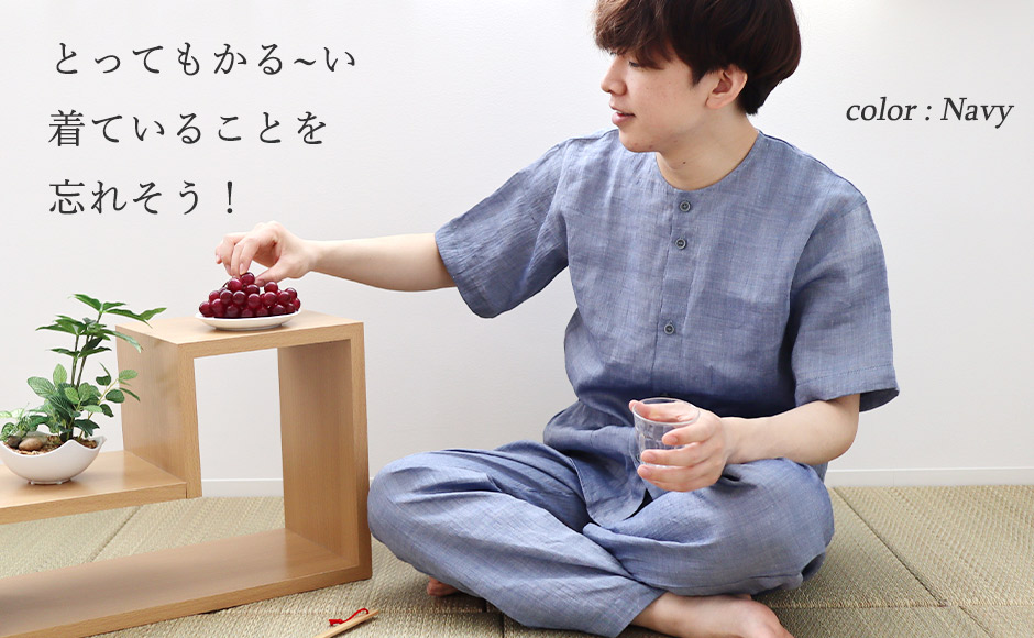 襟なしですっきりなノーカラーパジャマ。前開きタイプだから、羽織りとしても使えて便利!生地はシャリ感たっぷりの近江ちぢみ麻を使用しているので、汗をかいてもべたつきにくくひんやりと涼しいノーカラーパジャマです。パジャマとしてはもちろん、部屋着・ルームウェアにもおすすめです