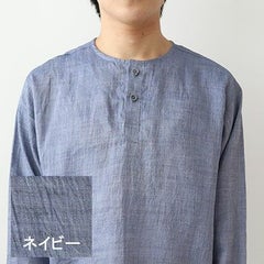 ちぢみ麻独特のシボ感が上品な印象を与えてくれます。ヘンリーネックの第一ボタンを開けても胸元が開きすぎずだらしなく見えません。涼しい夏のルームウェアとしてもおすすめです。