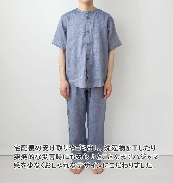 襟なしですっきりなノーカラーパジャマ。前開きタイプだから、羽織りとしても使えて便利!生地はシャリ感たっぷりの近江ちぢみ麻を使用しているので、汗をかいてもべたつきにくくひんやりと涼しいノーカラーパジャマです。パジャマとしてはもちろん、部屋着・ルームウェアにもおすすめです