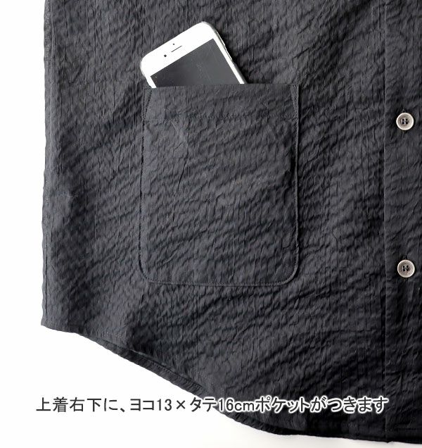 仕様 | 長袖 前開き(ボタン) 開襟えり 右下ポケット |