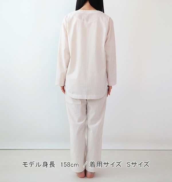 ポコポコ感でベタつかない!涼しく冷やさず快適な夏 先染めサッカーストライプレディースパジャマ 上下セット・長袖/かぶり/Vネック 【オーダーメイド】