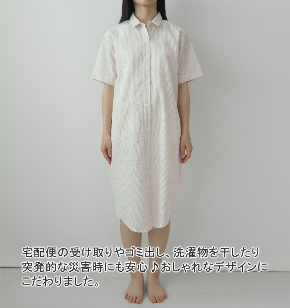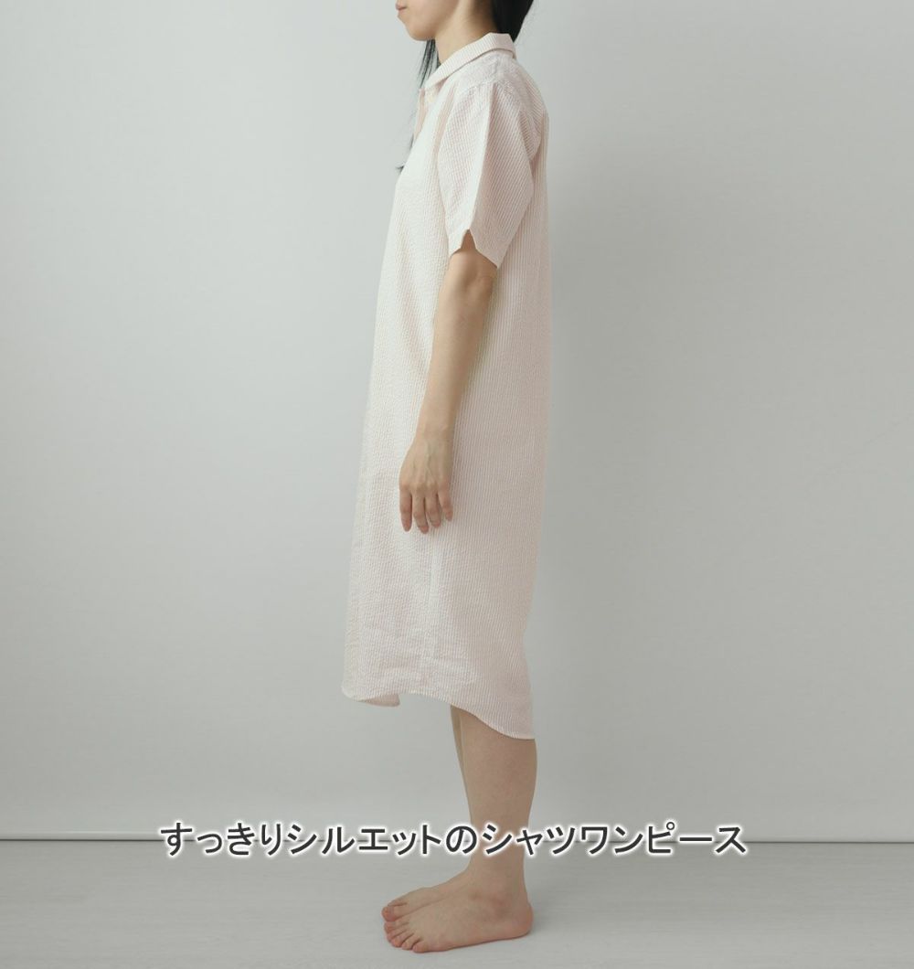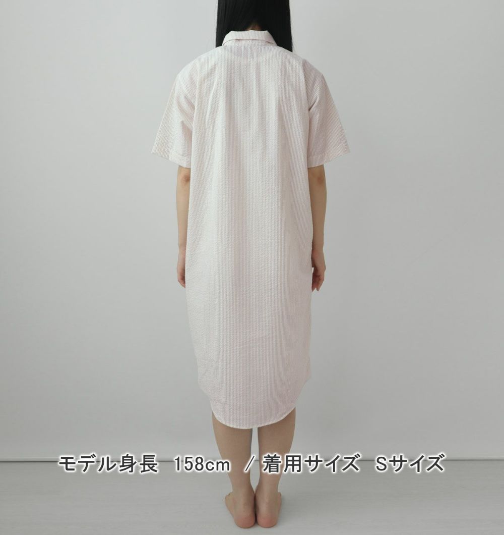 汗をかいてもはりつかない、さらさらのシャツワンピースが完成しました。一枚で着ても、パジャマの上から羽織ってもおしゃれに着ていただけます。サッカーストライプのぽこぽこした生地感はもちろん、カラーも清涼感たっぷり!