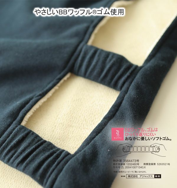生地のものや普通のゴムに比べて、サイドは2本のソフトな感触のBBワッフルRゴムを採用し、動きやすいお作りに。寝返りしても、万が一挟み込んでも切れにくく、しっかり体にフィットさせてくれます。ゴムをむき出しにすることなく、同表生地で覆うことで高級感ある仕上がりになっています。