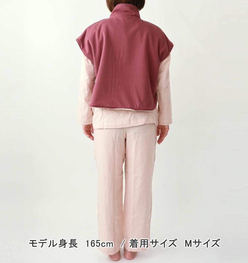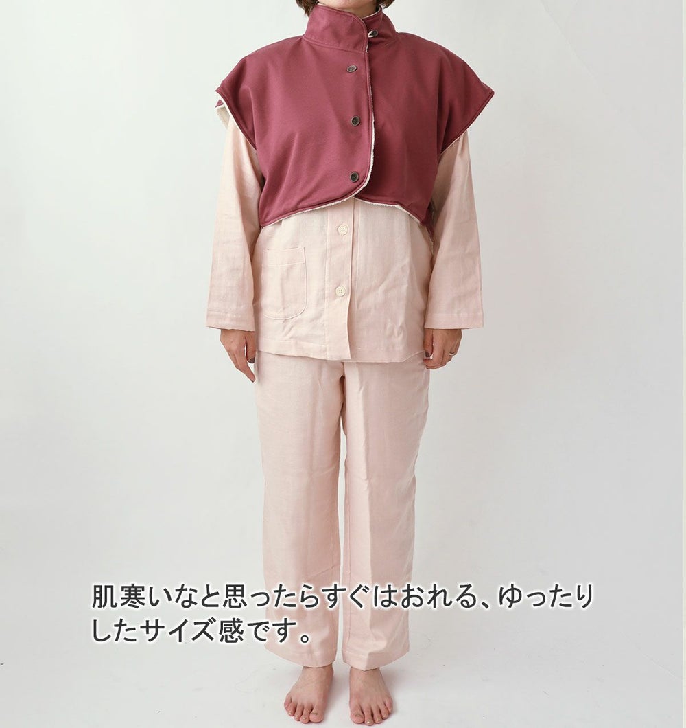 パジャマやルームウェアの上から着られる。締め付け感がなく、体を動かしやすい無理のないゆったりしたデザインです。