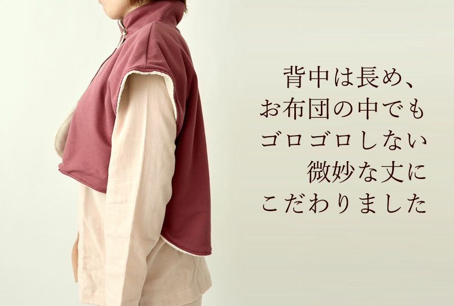肩が隠れる長さでしっかり覆え、冬の寒さや夏のエアコンから、冷えた肩を温めます。寝返りで首元や肩が出てしまうと寝冷えや肩こりの原因にも。動いても安心のちょうどいいサイズ感に仕上げました。