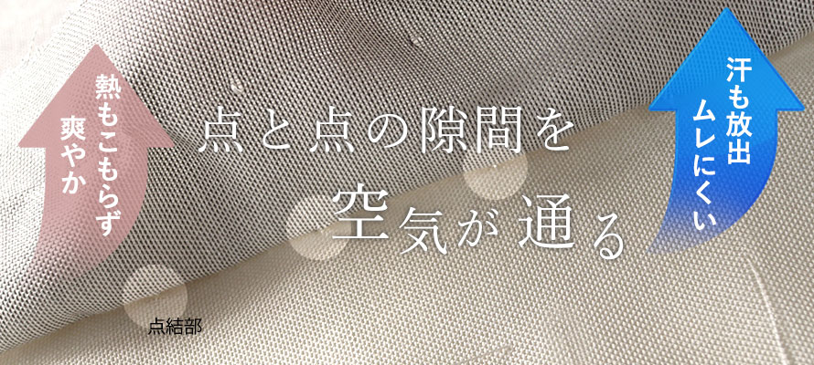 2枚のシルク100%ガーゼ生地をところどころ点で、結合して織られています。点結することで空気の通り道が多くできるため、熱や汗を放出、通気性抜群です。そして、シルクは綿に比べて吸水性、吸湿性が1.5倍でより蒸れを感じにくい生地に仕上げています。さらに2枚のガーゼ間に空気層ができ、ほどよい保温性がありつつも、「生きた繊維」といわれるシルクは温度調整をしてくれます。