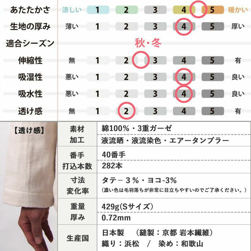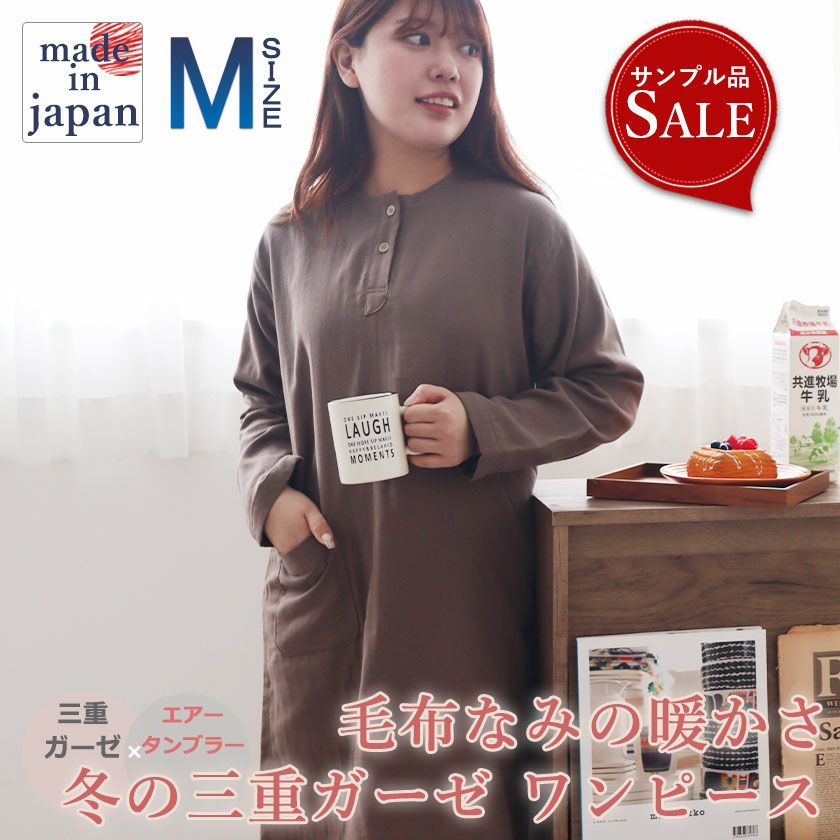タオルの産地・今治などで使われる、特殊な乾燥機で施した「エアータンブラー加工」。この特別なふっくら感によってできるガーゼの層に、たっぷりの空気が含まれやさしい暖かさが生まれます。2重よりも3重の方が必然的に暖かくなりますが、重なるガーゼの枚数だけでなく、ガーゼの層のふっくら感も保温性には非常に大切なポイントです。着るたびに、お洗濯するたびにふわふわのふっくらした暖かい冬のワンピースに!