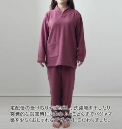 かぶりタイプで着脱しやすいショールカラーパジャマ。折っても立てても使えるヘチマ襟は、寒さや気分によって使い分けていただけます。パジャマ感が少ないので、ズボンだけ替えてちょっとした外出にも!カシミヤタッチコットショールカラーパジャマは部屋着・ルームウェアにもおすすめです。