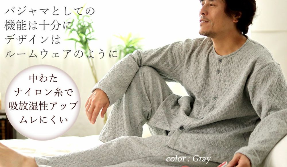 ニットキルトメンズパジャマ 上下セット・長袖/前開き/襟なし