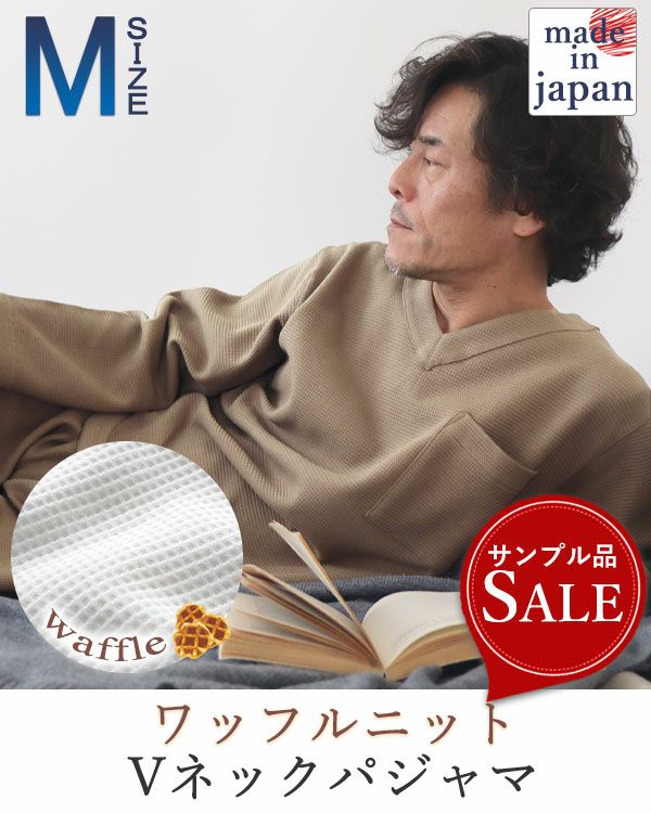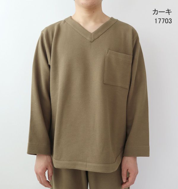 コットンワッフルニットメンズパジャマ上下セット・長袖/かぶり/Vネック