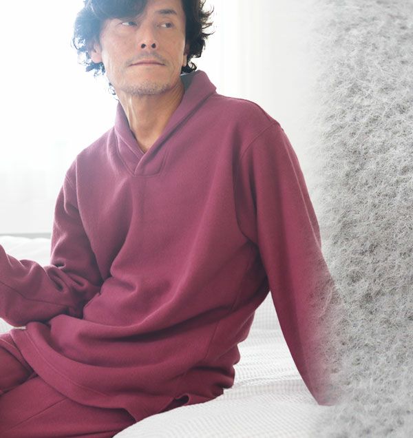 大変ご好評を頂いておりました 肌にあたる部分は綿なのに両面起毛であったかいコットンフリース。3年かけてなめらかさをプラスしたカシミヤタッチコットの開発に成功しました!!着た瞬間から温かさを体感頂けるカシミヤタッチコット。その名のとおり、カシミヤのように滑らかなので肌にそい、ぬくもりを逃がしません。上品なショールカラーは、ズボンだけチェンジしたら、ちょっとそこまで外出しても違和感のない、おしゃれなデザイン。