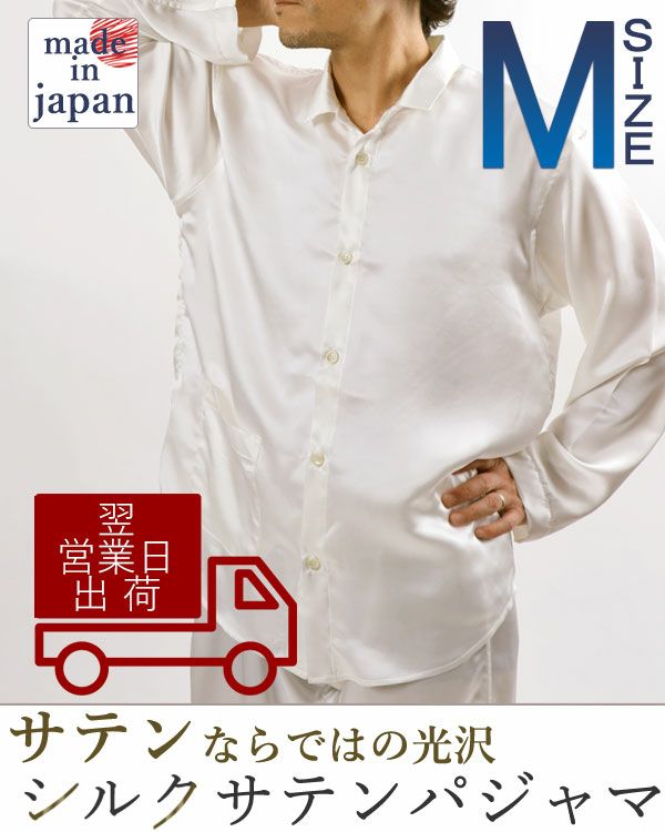 極上の光沢と肌触り 【翌営業日出荷】シルクサテンメンズパジャマ 上下セット・長袖/前開き/襟あり 【ホワイト/Mサイズ】