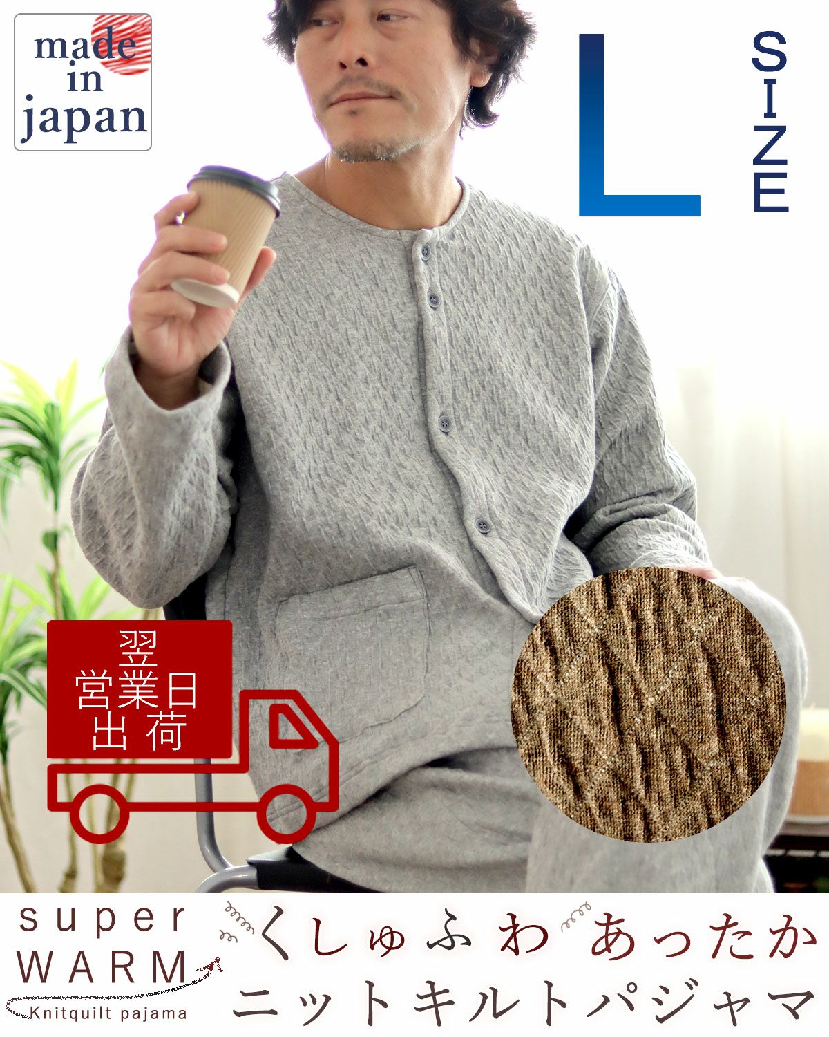 蒸れずに極暖!睡眠のために開発された冬のニットキルト 【翌営業日出荷】ニットキルトメンズパジャマ 上下セット・長袖/前開き/襟なし 【モカブラウン/Lサイズ】