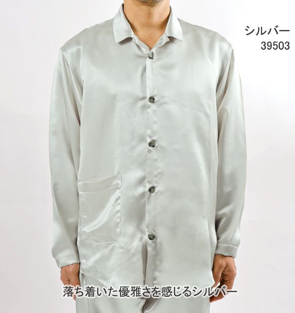 シルクサテンメンズパジャマ 上下セット・長袖/前開き/襟あり