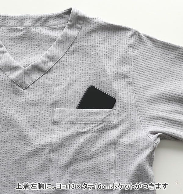 ポコポコした生地表面ではりつかず柔らかな風合いが心地よい天竺ニットサッカーのメンズパジャマです!おしゃれなVネックデザインで夏のルームウェアにも最適です。安全の日本製でセミオーダーメイド対応です!