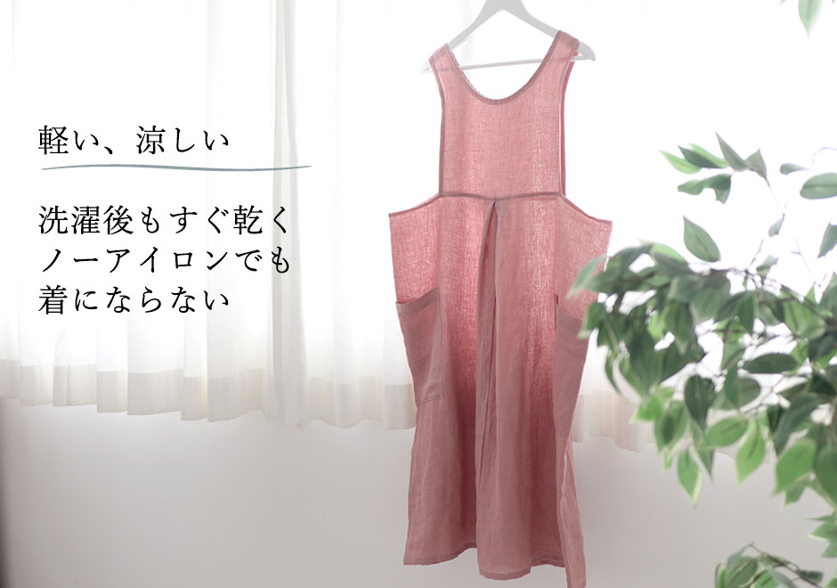 生地はクールクラッシュ加工という特別な加工を施したフランスリネン。高級な60番手糸で織りあげた生地は大変軽く、さらに加工でふわっとしておりお洋服にはりつかず、重ね着しているのに圧迫感なく疲れ知らず!またリネンは天然の防汚性、抗菌性がありエプロンには最適な素材です。