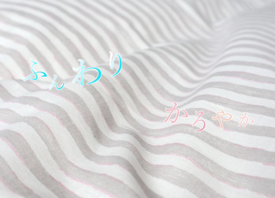 抗菌防臭効果のある、ピーチフレッシュ加工のダブルガーゼ。通気性や吸放湿性にも優れ、いつでもさらっと清潔にお過ごしいただけます。