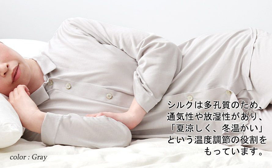 綿に比べて吸水性、吸湿性が1.5倍でより蒸れを感じにくく、ほどよい保温性があります。また「生きた繊維」といわれるシルクは多孔質のため、「夏涼しく、冬温かい」という温度調整をしてくれて一年中快適なシルクニットパジャマです。