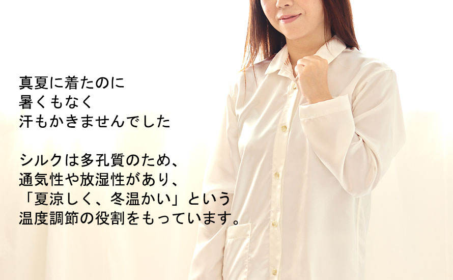 シルクは多孔質のため「夏涼しく、冬温かい」という温度調節の役割をもっています。綿に比べて吸水性、吸湿性が1.5倍でより蒸れを感じにくく、ほどよい保温性がありつつも、温度調整をしてくれるため、夏涼しく、冬温かい、一年中快適なスモールカラーパジャマとなっています。