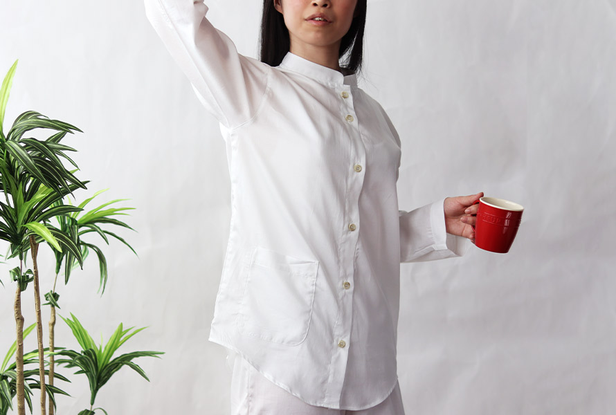 おしゃれなバンドカラーのデザインは ちょっとそこまで、上着を羽織って朝のパンを買いにいったり、ごみを出したり、外出を可能にしました。ボタンをはずしただけで全く違う印象に・・・。シルクのような光沢と滑らかさのスーピマ超長綿で贅沢な時間を。