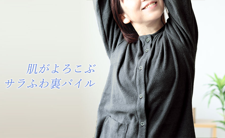 パイル地、タオル地といっても実はたくさんの種類がありますが、パジャマにとって必要なこと、「吸放湿性があること」「寝返りがしやすいこと」「肌触りが良いこと」を追及するとこの両面パイルニットにいきつきました!日本に1社しか持っていない機械で1日に約100mほどしか作れない大変希少なパイルでつくったパジャマ、ルームウェアです。