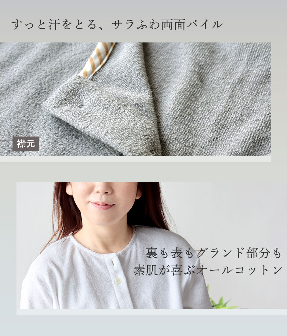短めのパイルループでさらりとした感触のタオル地だから使い心地満点!透けにくいく、動きやすいからパジャマとしてだけでなくルームウェアとしても