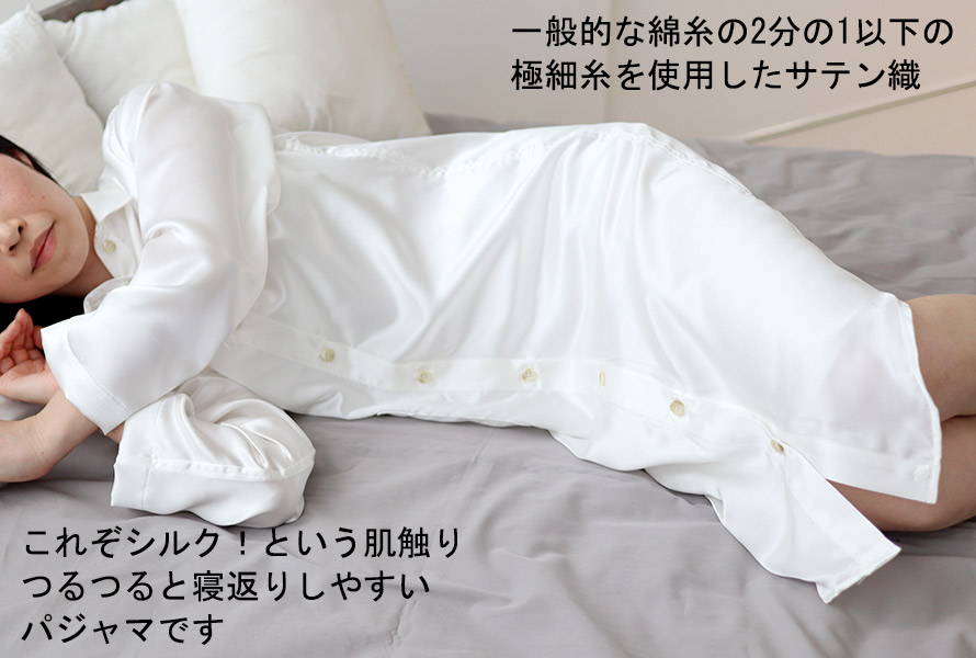 このシルクは19匁で、一般的な綿のパジャマの約30%も軽く、なおかつ耐久性も良いというバランスのよい齋栄織物に特注した国産の川俣シルクサテンの当店オリジナル生地です。