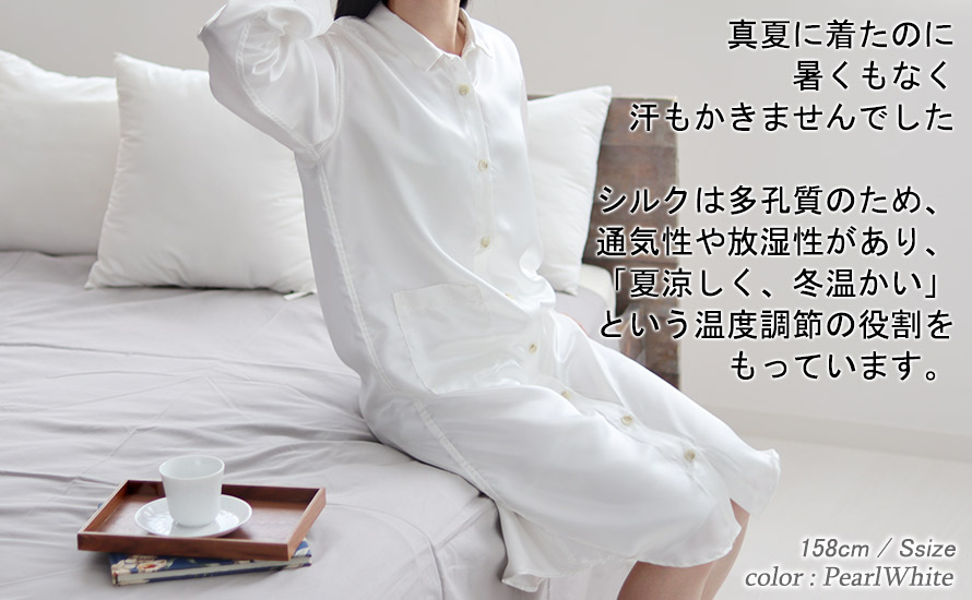 シルクは多孔質のため「夏涼しく、冬温かい」という温度調節の役割をもっています。綿に比べて吸水性、吸湿性が1.5倍でより蒸れを感じにくく、ほどよい保温性がありつつも、温度調整をしてくれるため、夏涼しく、冬温かい、一年中快適なワンピースとなっています。