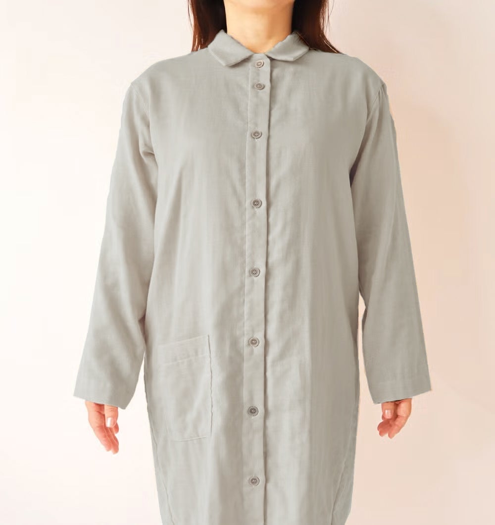 手術、入院にも使える前開きのワンピース。柔らかいダブルガーゼですので、ストレスなく快適に部屋着、ルームウェア、羽織りとしてもご使用いただけます。シャツワンピースのデザインで、すっきりしたシルエットです。