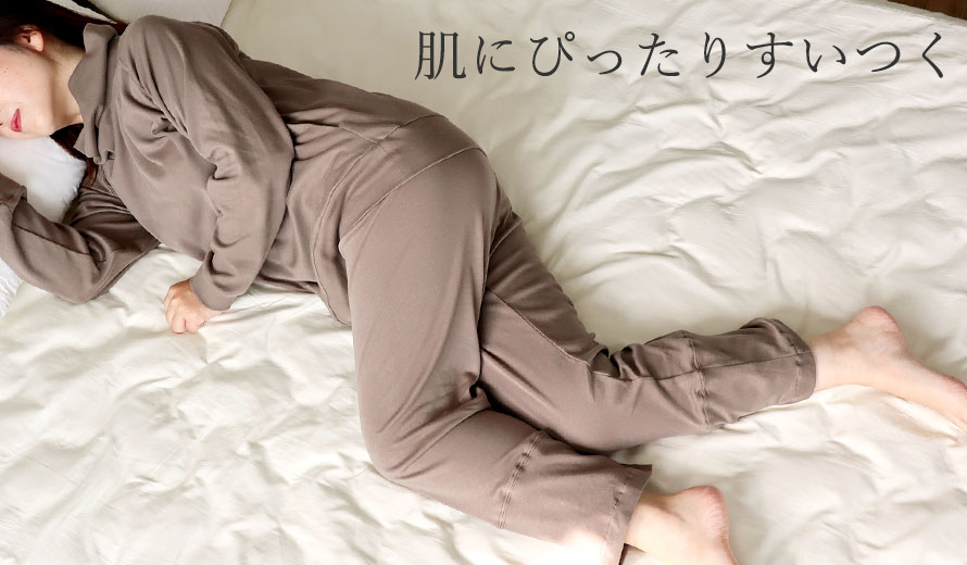 のびるニット生地なので、体を動かしやすく、寝返りも楽々。まるで着ていないようなリラックスした着心地です。また、ストレッチ素材は、ポリウレタンが混ざっていることも多いですが、こちらは天然素材の綿100%なので、肌にやさしく、蒸れずに快適です。