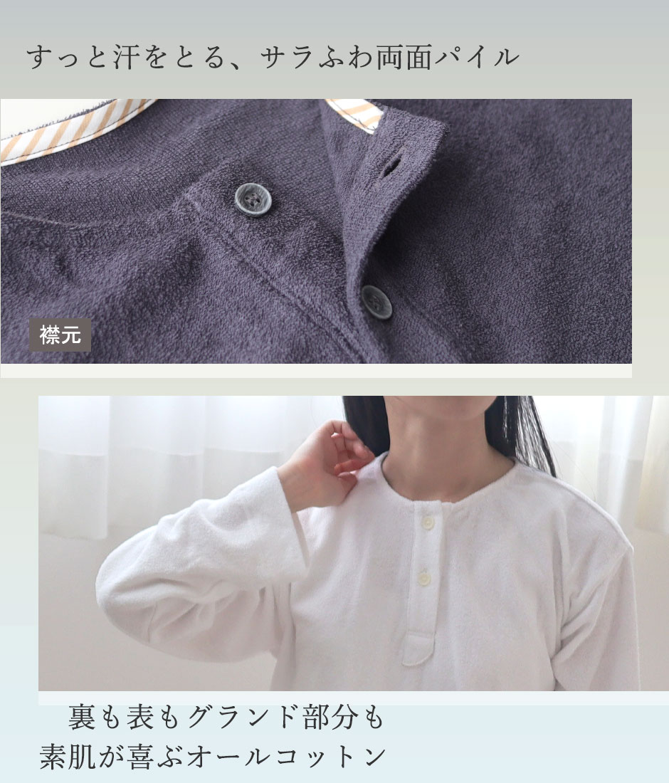 伸縮性のあるニットパイルだから着やすく、寝返りもうちやすく、動きやすい!夏に人気のタオル地は1日中着ていてもストレスがありません。適度に保温性があるので春先から初夏まで。秋口から真冬までの長い間お使い頂けます。