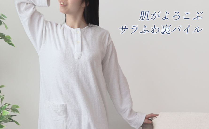 パイル地、タオル地といっても実はたくさんの種類がありますが、パジャマにとって必要なこと、「吸放湿性があること」「寝返りがしやすいこと」「肌触りが良いこと」を追及するとこの両面パイルニットにいきつきました!日本に1社しか持っていない機械で1日に約100mほどしか作れない大変希少なパイルでつくったパジャマ、ルームウェアです。