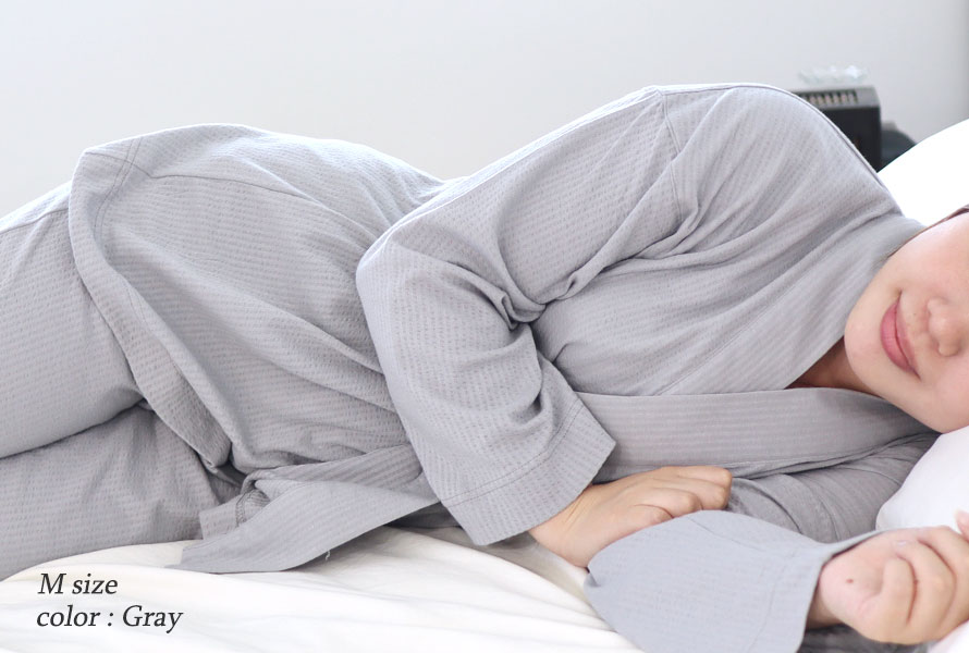 締め付け感がなく、体を動かしやすい無理のないゆったりしたデザインで24時間ストレスフリー。さらに内紐、外紐で調節できるので体型の変化にも対応、ルームウェアとして、パジャマがわりとしても。