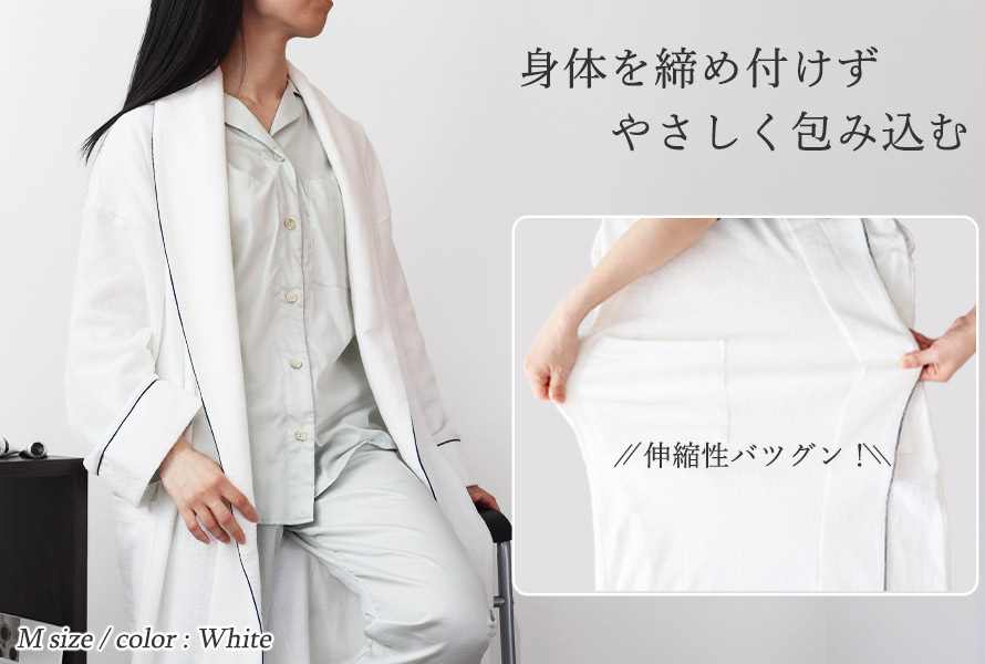 窮屈さなくリラックスいただけるようゆったりめのサイズ感に。さらにパイルニット素材だから、伸縮性抜群で快適♪バスローブとしてはもちろん、パジャマの上からガウンとしても着用していただけます。