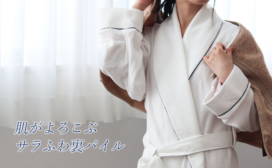 パイル地、タオル地といっても実はたくさんの種類がありますが、バスローブにとって必要なこと、「吸放湿性があること」「寝返りがしやすいこと」「肌触りが良いこと」を追及するとこの両面パイルニットにいきつきました!日本に1社しか持っていない機械で1日に約100mほどしか作れない大変希少なパイルでつくったバスローブです。