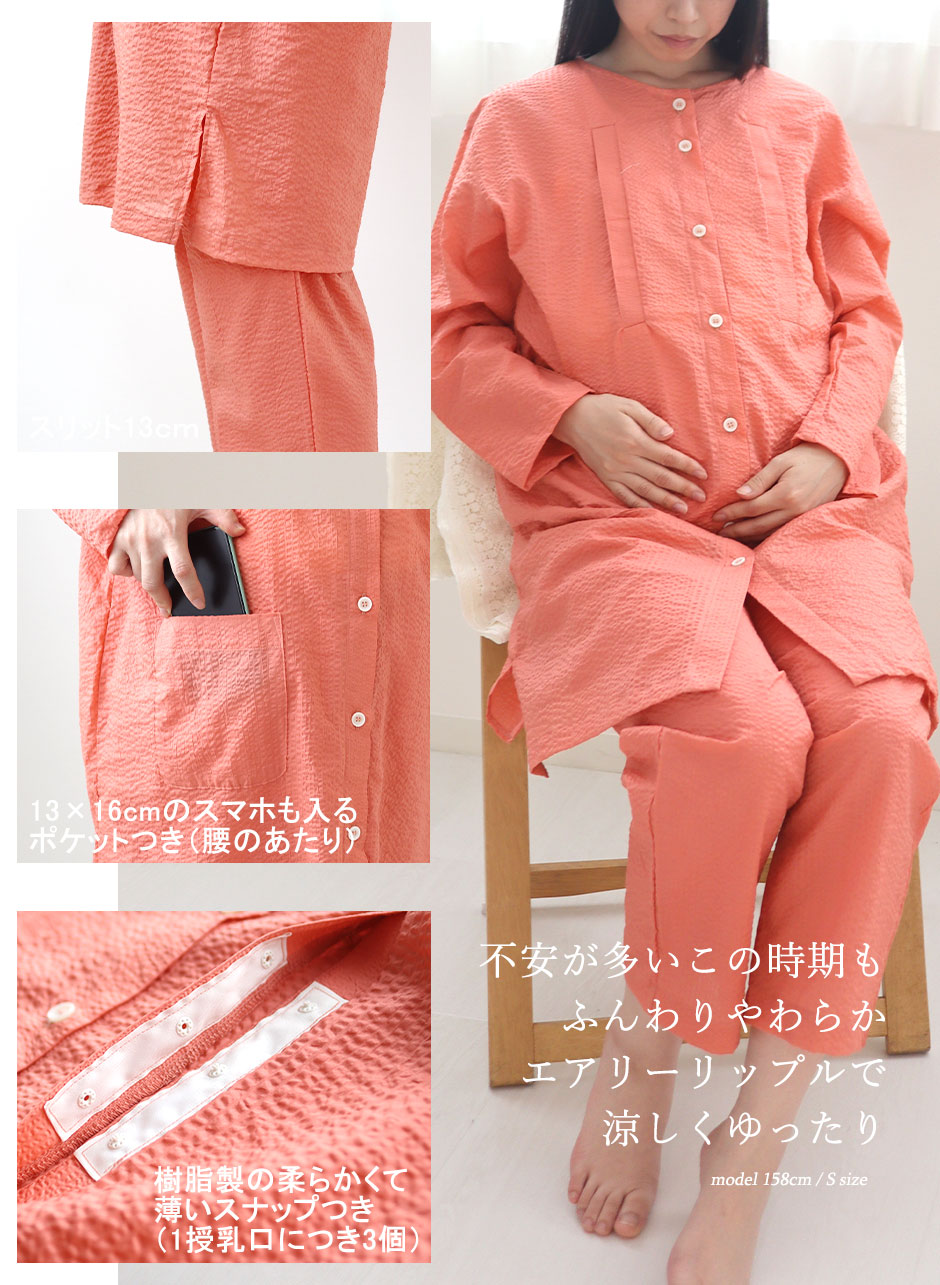 授乳口つきで安心、前開きだから入院準備にも使えるマタニティパジャマ