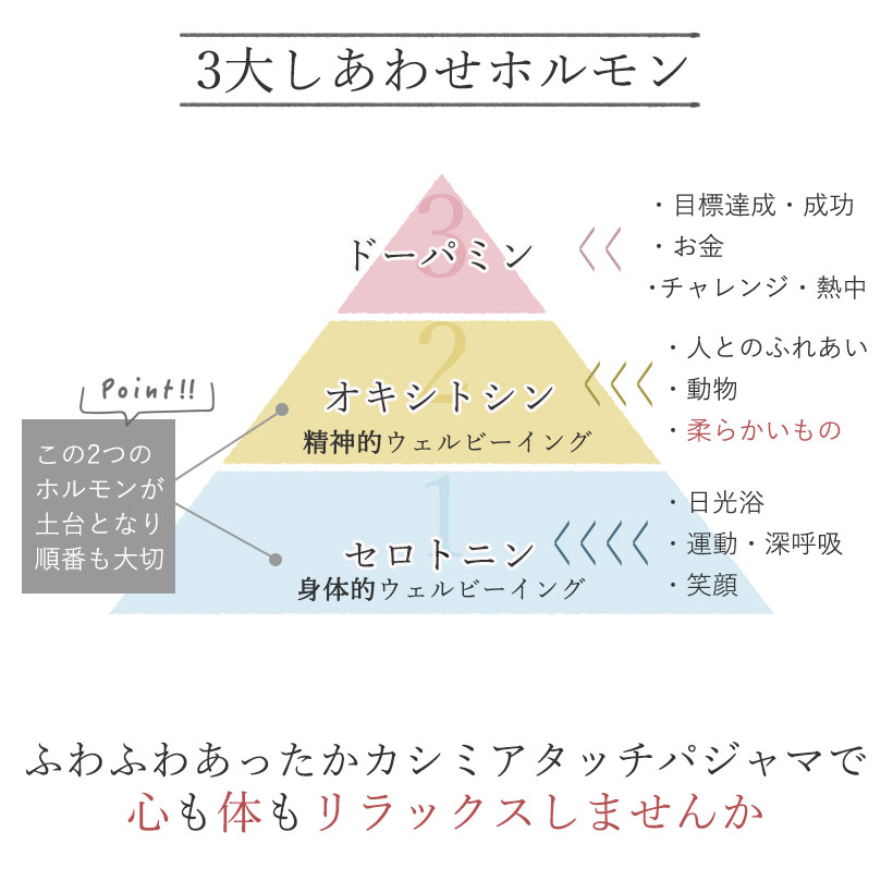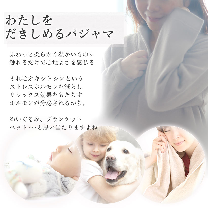 ふわっと柔らかいものに触れると、幸せホルモンのひとつ、オキシトシンというリラックス効果をもたらすホルモンが分泌されます。オキシトシンは3大しあわせホルモンのひとつで、精神的に良好な状態をもたらすといわれています。だきしめられるようなほっとする自然のぬくもり、カシミヤタッチコットパジャマでとことんリラックスしませんか。