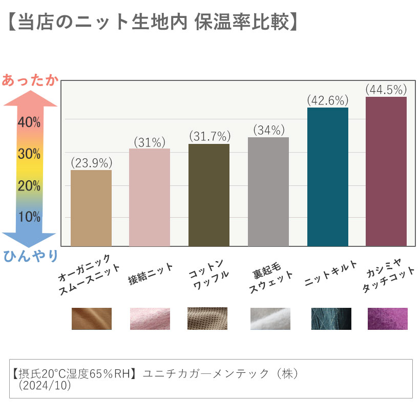 生地の保温率だけを比較すると、カシミヤタッチコットがニット生地の中で、一番数値が高くなりました。
