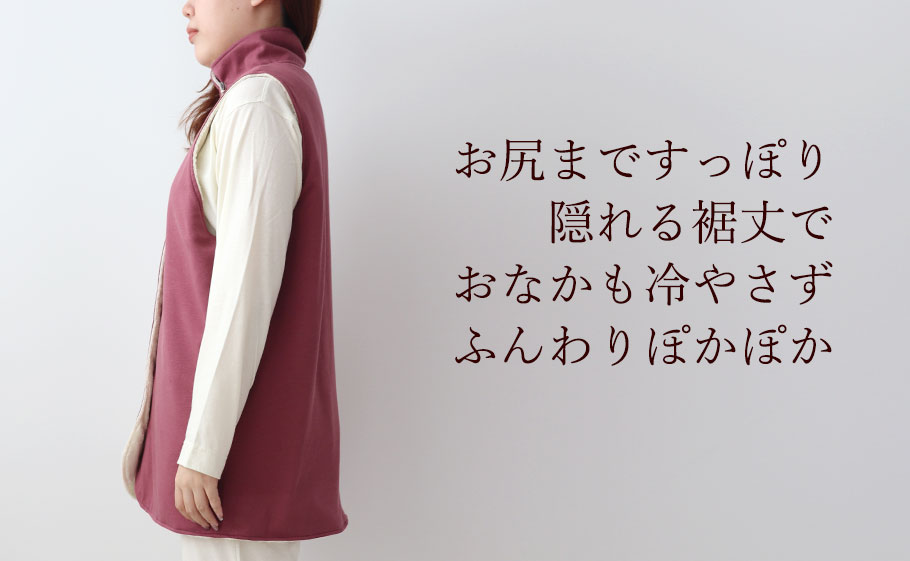 冬場は特に冷えやすいおなか。冷えないようしっかり防寒しつつも家事などがしやすいよう、動きやすい着丈にこだわりました。