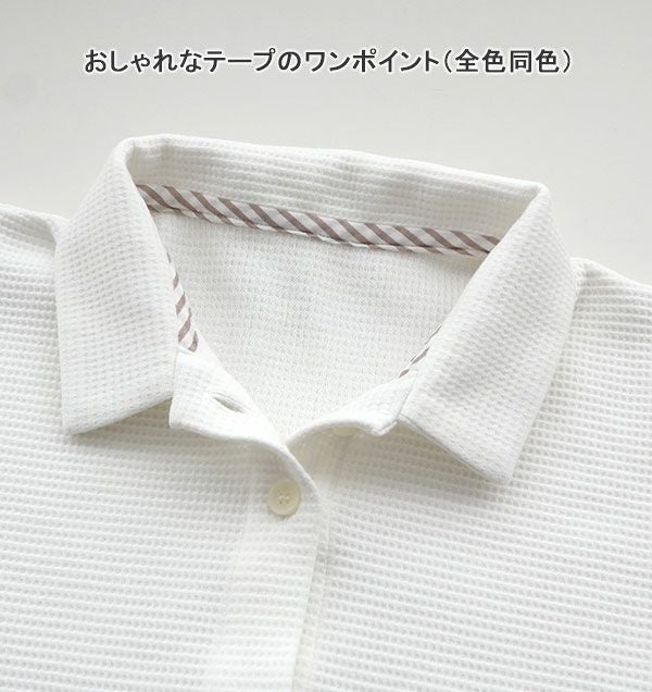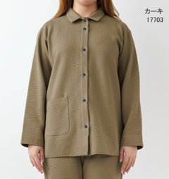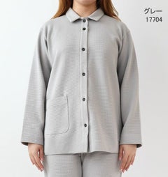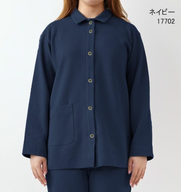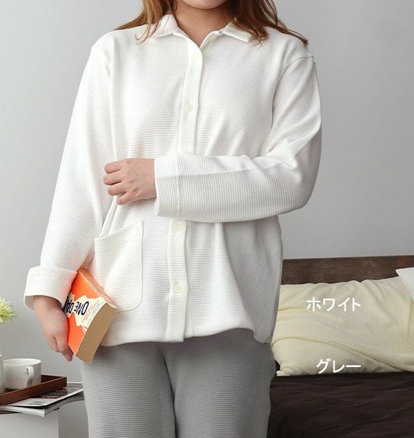 コットンワッフルニットレディースパジャマ 上下セット・長袖/前開き/襟あり