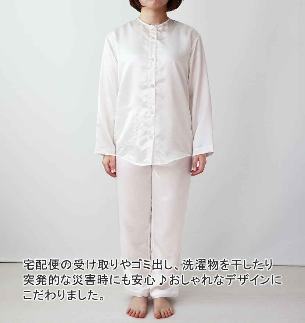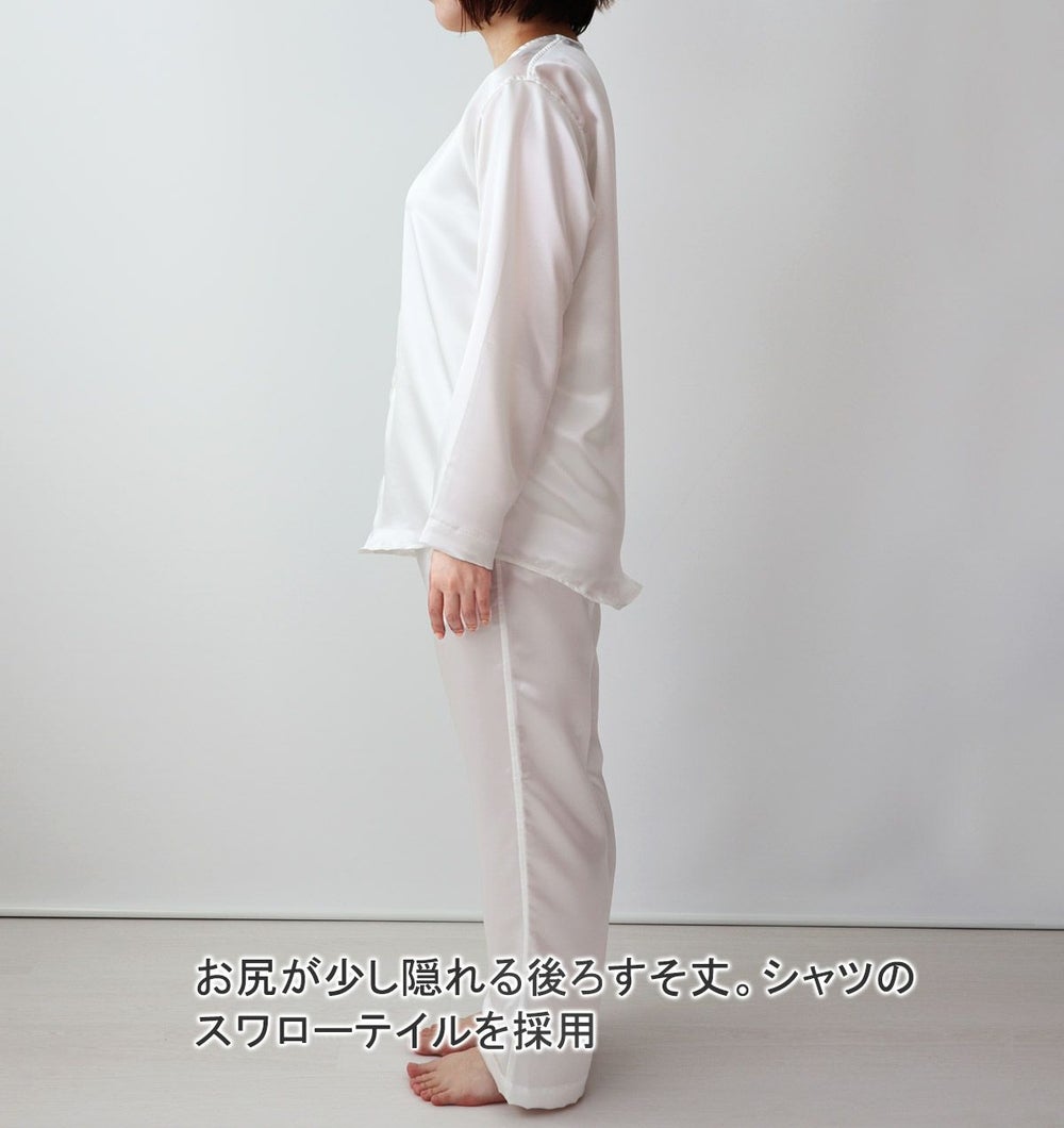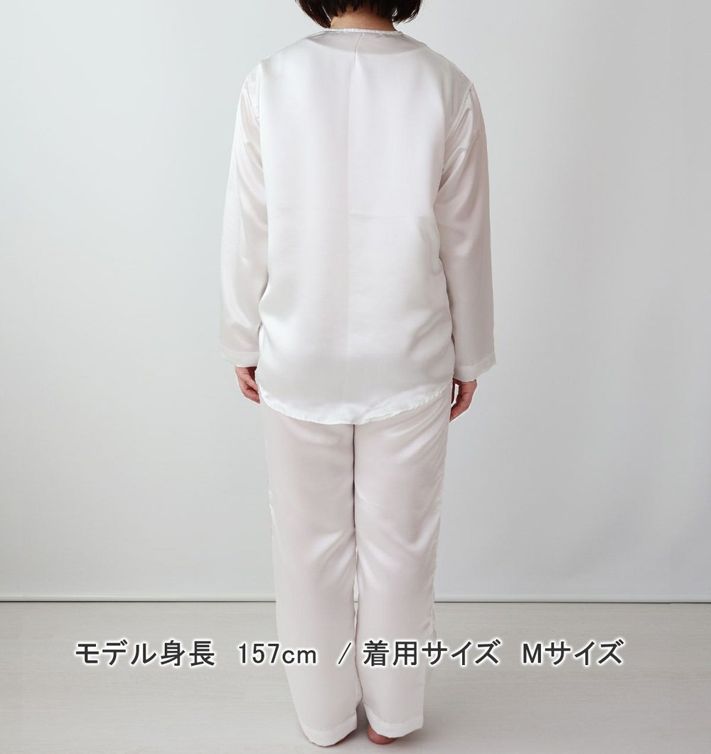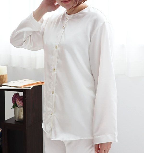 川俣シルクサテンレディースパジャマ 上下セット・長袖/前開き/襟なし