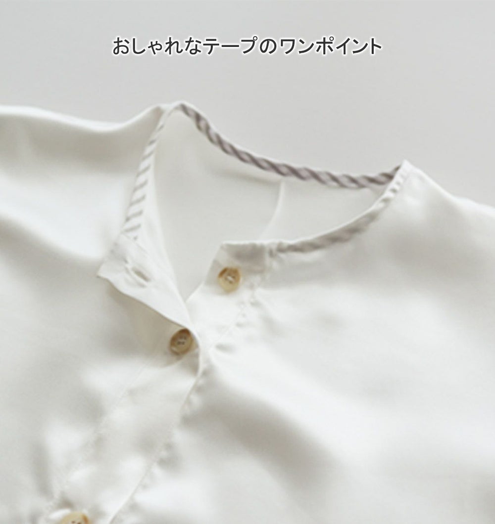 シルクは多孔質のため「夏涼しく、冬温かい」という温度調節の役割をもっています。綿に比べて吸水性、吸湿性が1.5倍でより蒸れを感じにくく、ほどよい保温性がありつつも、温度調整をしてくれるため、夏涼しく、冬温かい、一年中快適なノーカラーパジャマとなっています。