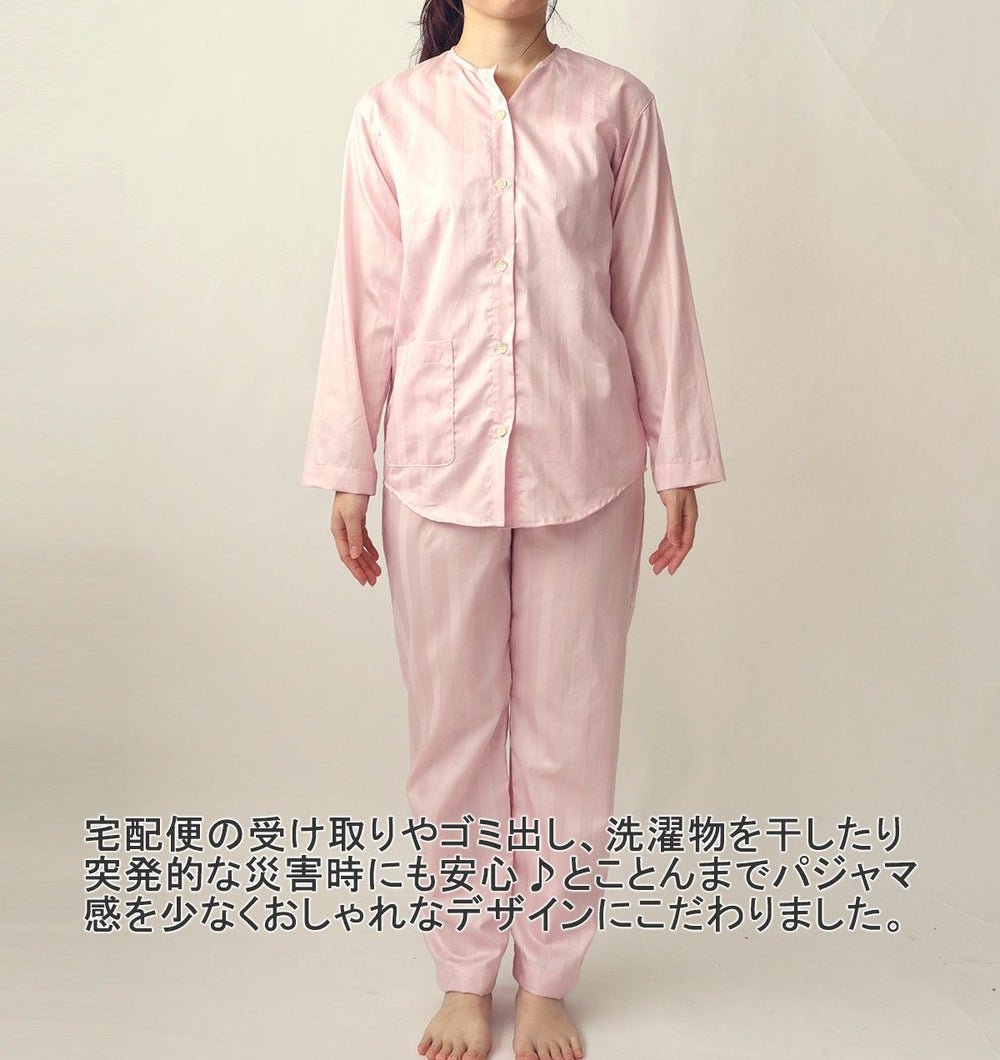 いろんなホテルでも採用されているサテンストライプ。ホテルに滞在しているようなラグジュアリーなひとときを。ズボンだけかえればゴミ出しはもちろん外出にも着ていけそうです!