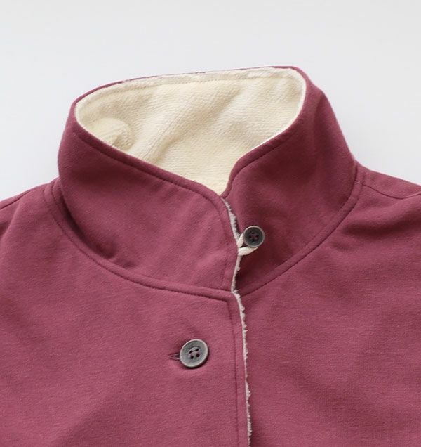 立ち襟の高さは7cm。お休み時は立てて、お風呂上りなどは、柔らかい素材なので、ねかしてと2通り使えます。ゆとりあるデザインで締付け感なくお休み頂けます。お歳を召した方にも安心、大き目のボタンでしっかり凸凹があるのではめやすくなっています。