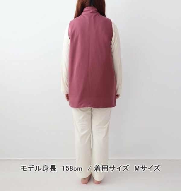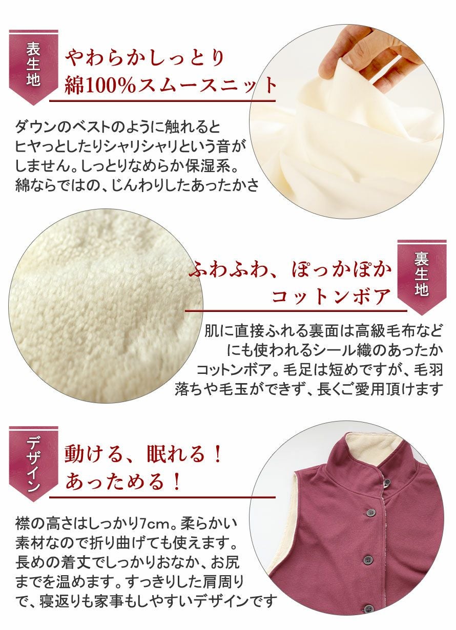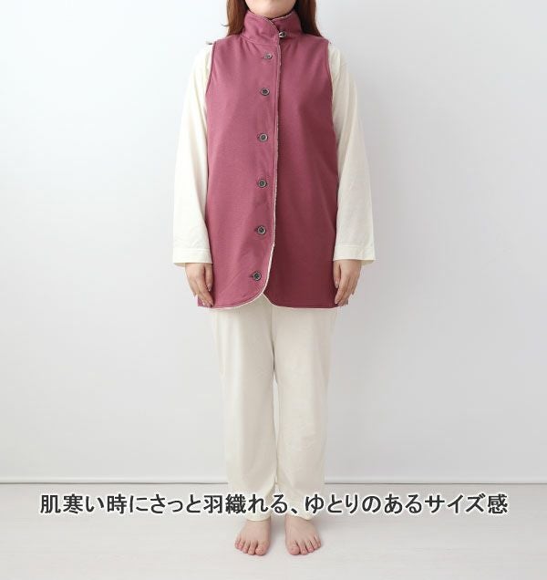 ベストといえば、ダウンのものが多いのですが、中からダウンが飛び出さない加工をされたもの(ダウンプルーフ加工)の生地はポリエステル等のシャリシャリと音がしたり、ヒンヤリ感じたり、蒸れたり羽毛の独特の匂いが気になる方も。次に多いのがフリースのベスト。初めはあったかいのですが、体温があがるにつれてムレてきて、知らず知らず寝ている間に脱いでしまうことも。また冬は静電気も気になりますね。このベストは綿100%でもしっかり防寒、肌がデリケートな方、ダウンやフリースの欠点が気になる方にぜひおすすめです!